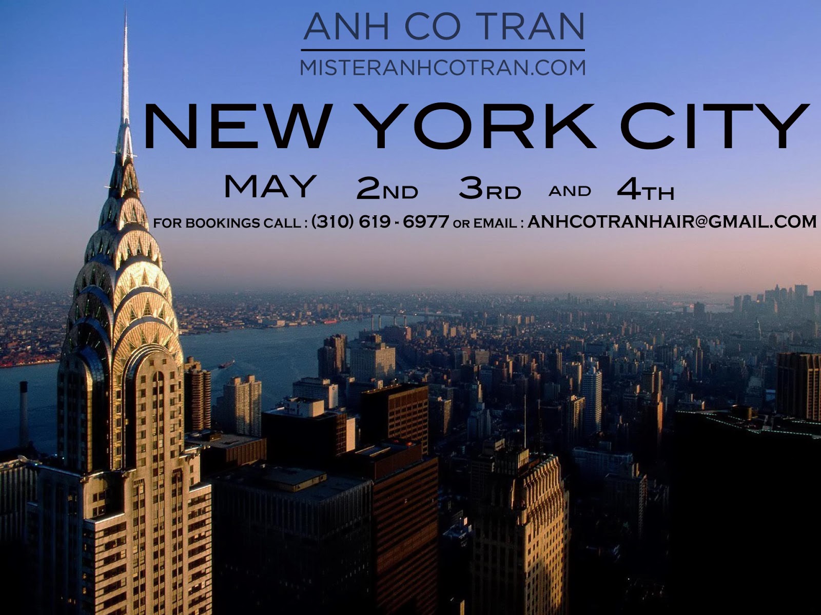 April 29, 2013 NYC: BOOKING NOW! 5/2-5/4 FOR BOOKINGS CALL: (310) 619-6977 OR EMAIL: ANHCOTRANHAIR@GMAIL.COM Anhspiration, In the Chair, Travel Diaries Share: