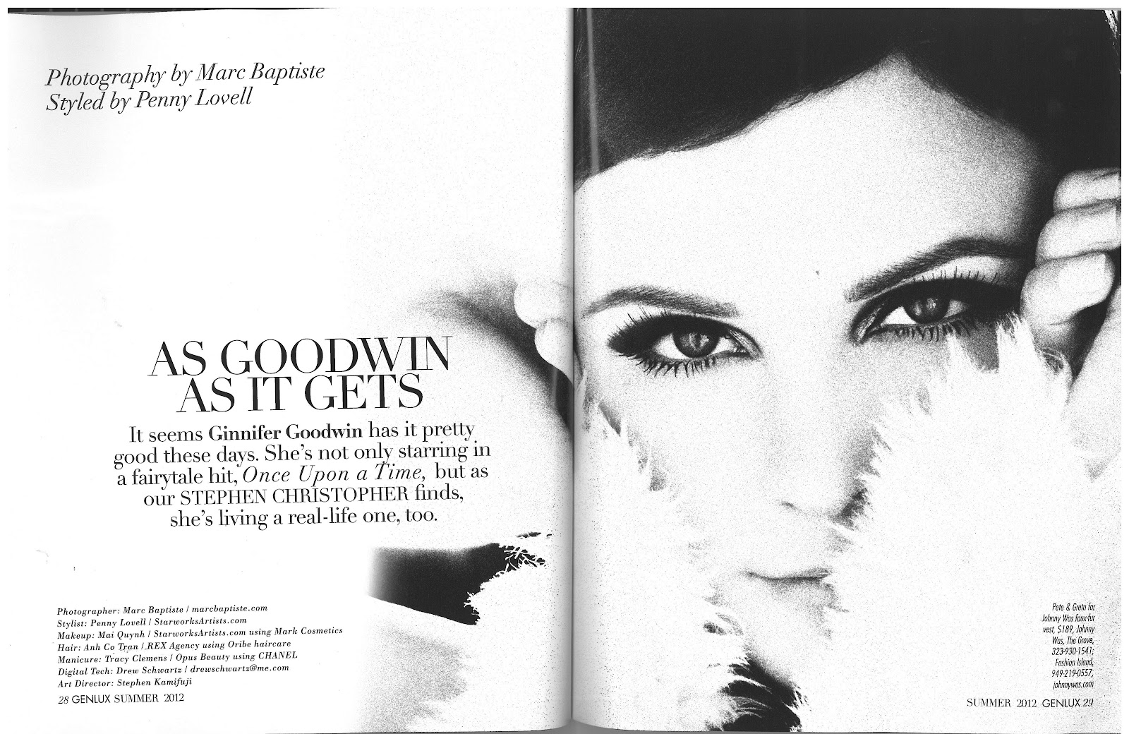 July 12, 2012 GINNIFER GOODWIN: GENLUX MAGAZINE GINNIFER GOODWIN FOR GENLUX MAGAZINE SUMMER 2012. PHOTOGRAPHY: MARC BAPTISTE, STYLED: PENNY LOVELL, MAKE UP: MAI QUYNH, HAIR: ANH CO TRAN, MANICURE: TRACY CLEMENS. Editorial, Featured Share:
