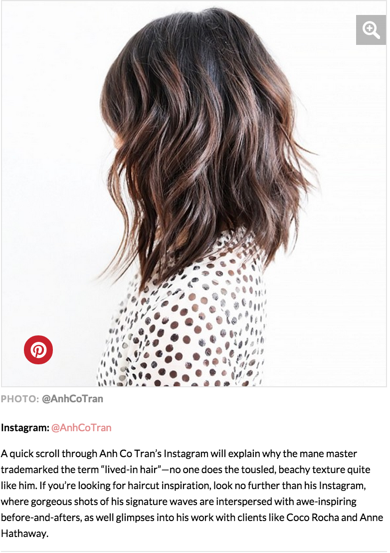 “A quick scroll through Anh Co Tran’s Instagram will explain why the mane master trademarked the term “lived-in hair”—no one does the tousled, beachy texture quite like him. If you’re looking for haircut inspiration, look no further than his Instagram, where gorgeous shots of his signature waves are interspersed with awe-inspiring before-and-afters, as well glimpses into his work with clients like Coco Rocha and Anne Hathaway.” (READ MORE)